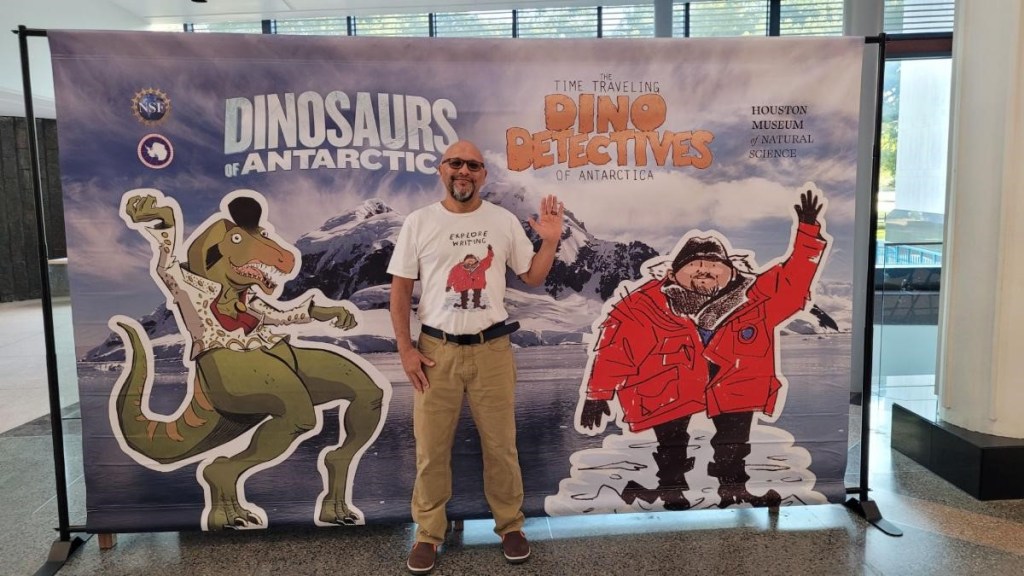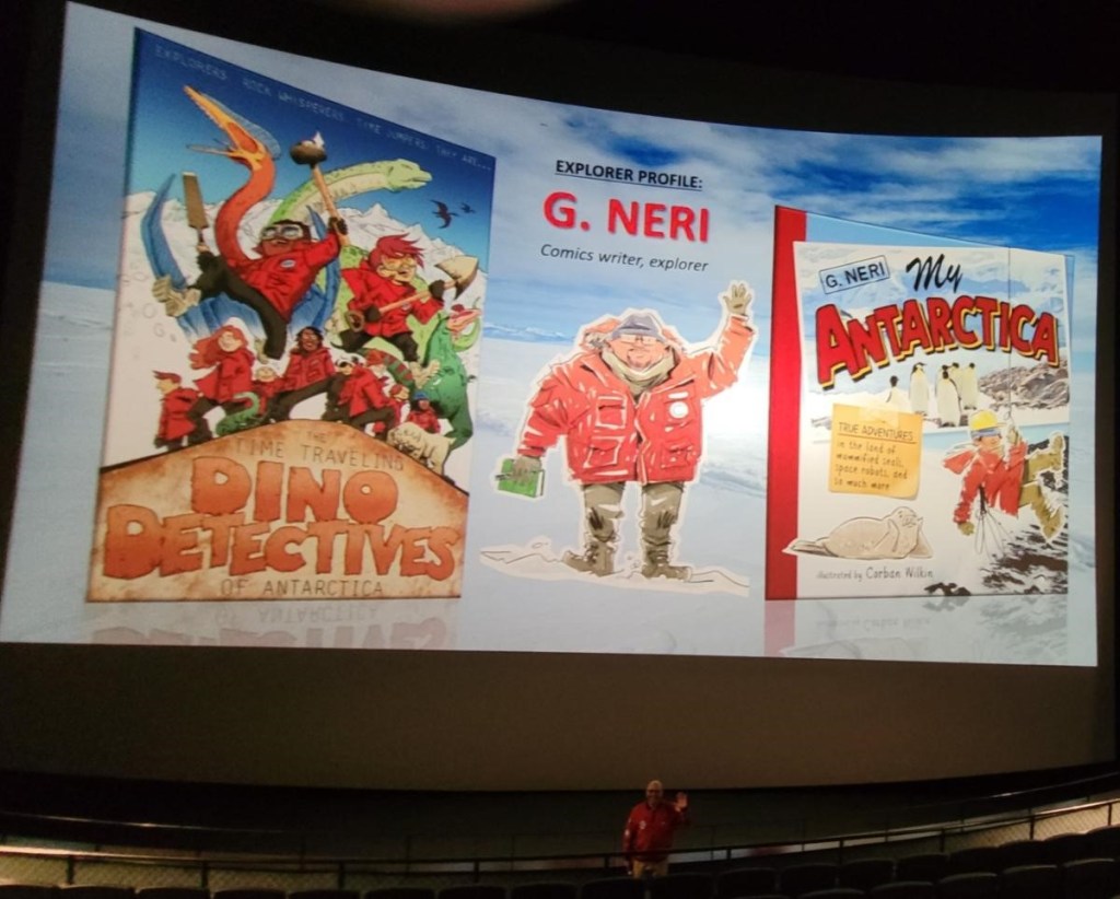 The ever-wayfaring author of the book, G. Neri, got to see both of our Antarctica books up on the big giant screen ahead of the Houston Museum of Natural Science showing Dinosaurs of Antarctica, the sister documentary to our book Dino Detectives, in their Giant Screen Theatre.