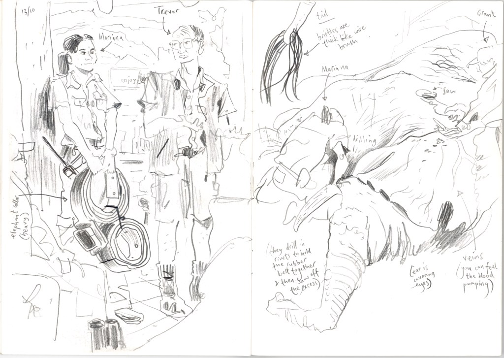 But being there, and being a part of it, mattered. From people’s kind and open responses to what I was doing, I learned that by being there I could do much more than simply draw animals: I learned that I might be able to articulate something of how it feels to be there, in the trees where an elephant has fallen, to feel her heated breath, the pulse in her ears, the texture of her skin. And the mood, the tension, the atmosphere. And the determination and care of the people who do this work.
