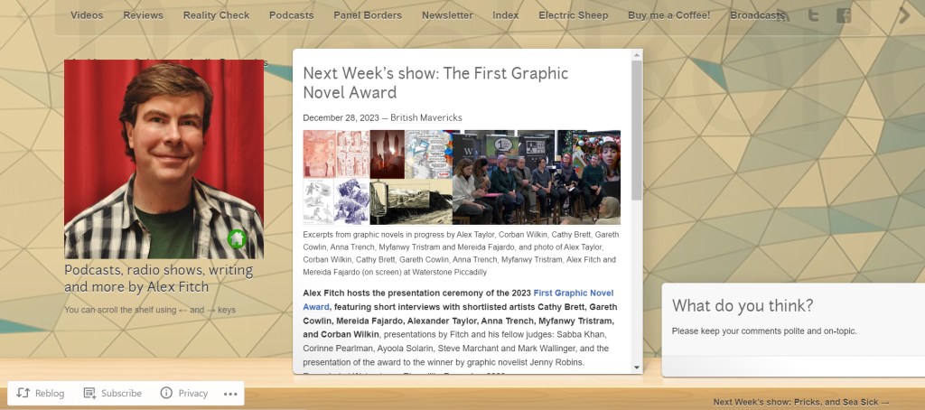 Also thank you to James Spackman and the BKS agency, the ALCS, The Cartoon Museum, SelfMadeHero, BBC Radio 4’s Front Row, and to Waterstones for hosting the event! This is all so much more than I deserve and I can’t really express how grateful how I feel. And congratulations once more to the star of the event, Alex Taylor!