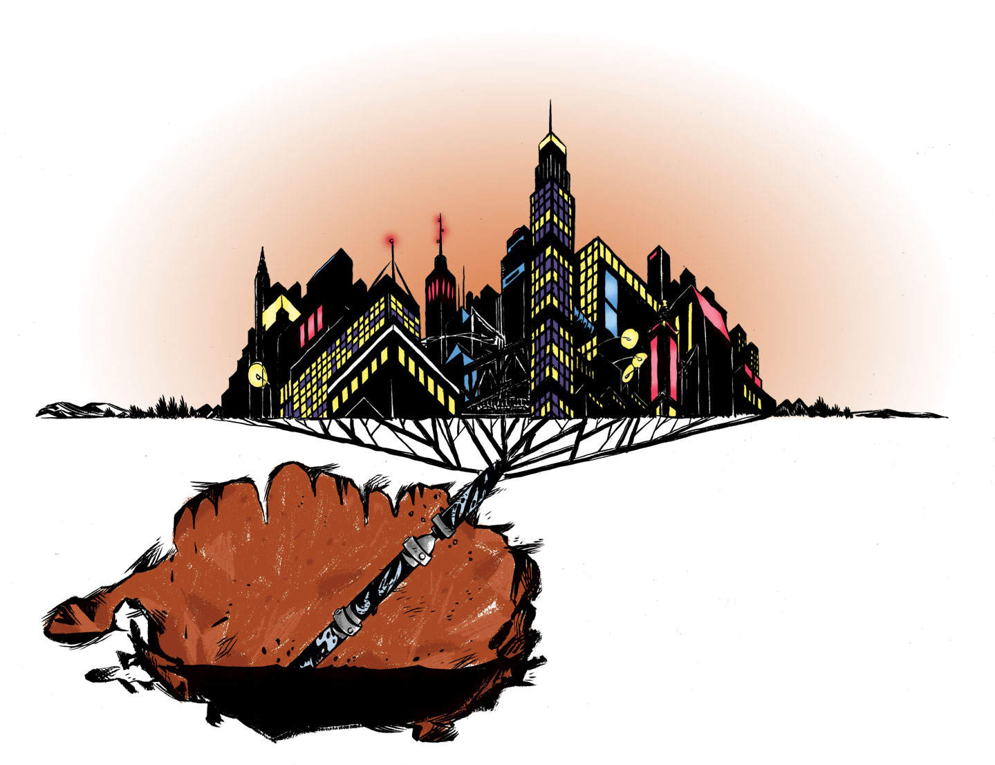 Above: an unused illustration for A Dream of a Low Carbon Future. Looks like brown crayon in the lower part there, but it’s just pixels.