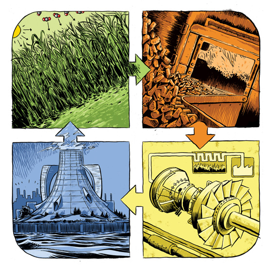 this is just one illustration for an upcoming info-comic-book, pamphlet, public-information type-thing, that I’ve been working on with the Supergen Bioenergy Hub. It shows energy crops being grown to produce bioenergy and reabsorb emissions released by the previous generation of energy crops, ad infinitum. Drawn with a brush and ink, but coloured digitally!