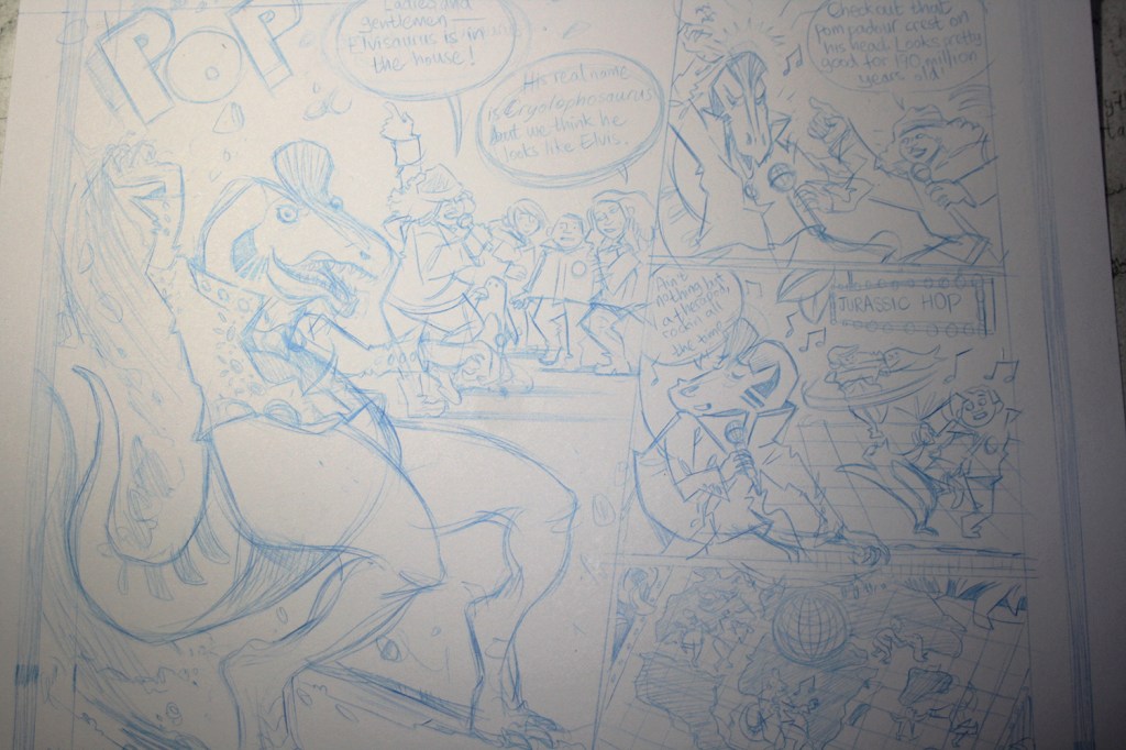 When I was giving school talks about Dino Detectives I spoke a bit about the process of going from script to full-colour artwork when making a page of comics. I thought I’d share here the examples that I used from the book, going from a script, to thumbnails, to scrappy roughs, to blue-line underdrawing, to the final line drawing. Then the process of layering the colour on, from background, to characters, then adding details, then shadows, and finally a few special lighting effects.