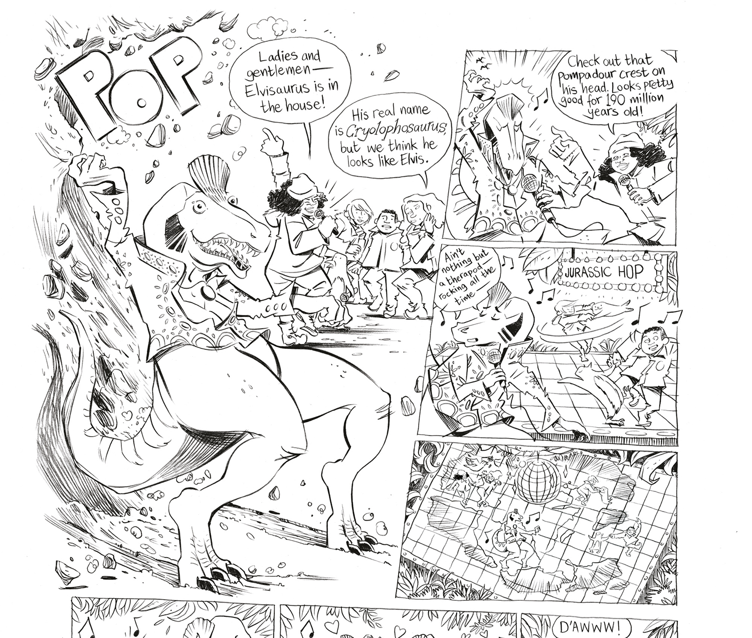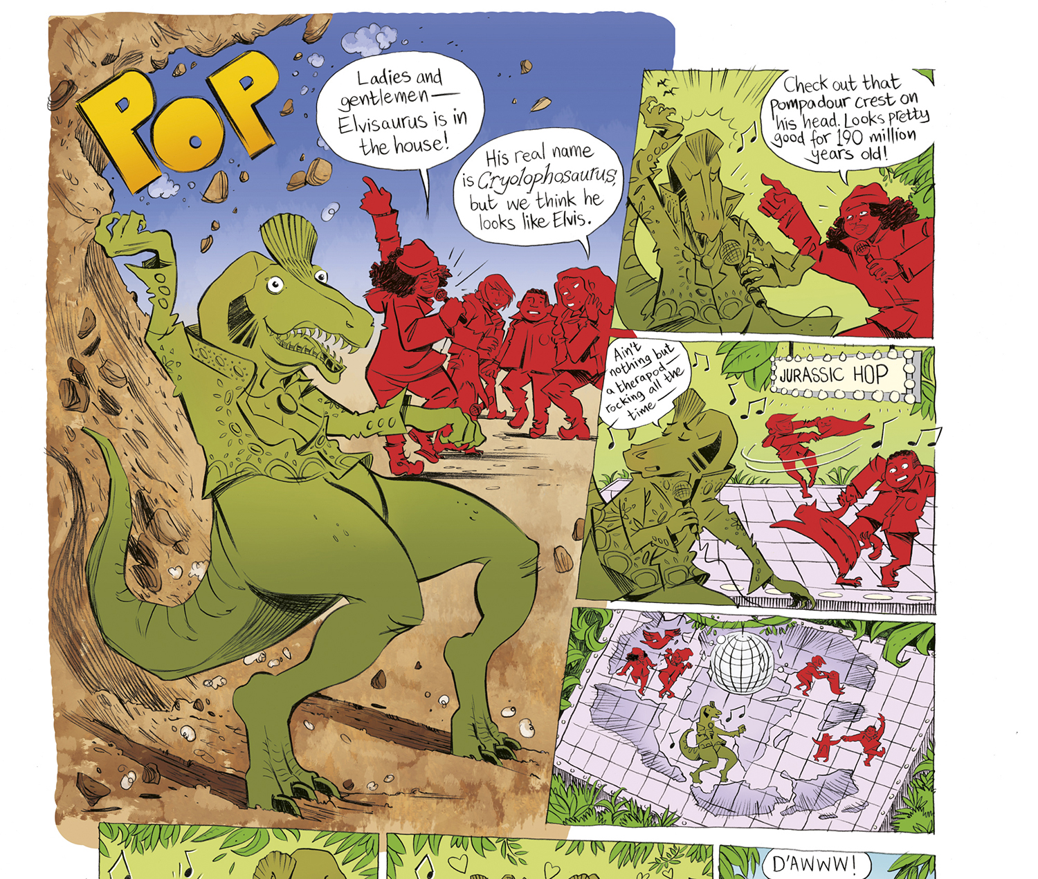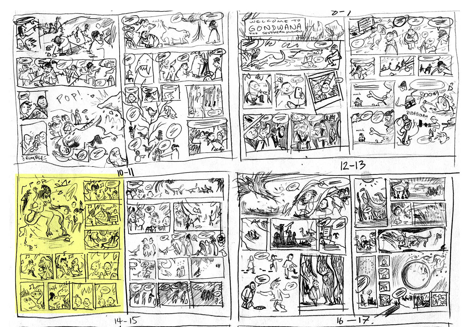 When I was giving school talks about Dino Detectives I spoke a bit about the process of going from script to full-colour artwork when making a page of comics. I thought I’d share here the examples that I used from the book, going from a script, to thumbnails, to scrappy roughs, to blue-line underdrawing, to the final line drawing. Then the process of layering the colour on, from background, to characters, then adding details, then shadows, and finally a few special lighting effects.
